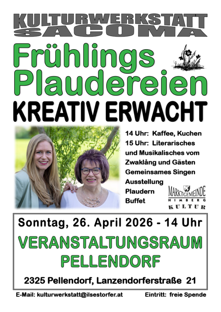 APRIL 2026 Heimatkundliche Abende14. April 202619:00Hotel "Das Himberg" MEHR INFO Orchester MOSAIK18. April 202611:00Volkshaus Himberg MEHR INFO Bücherflohmarkt18. April 202610:00Kultursaal, Wienerstraße 4-8 MEHR INFO Andreas Vitasek – „Wie es mir gefällt“ Vorpremiere22. April 202620:00Volkshaus Himberg MEHR INFO Blumen-Erde-Fest25. April 202609:30Hintere Ortsstraße 67, Stadl F. Schmalzl MEHR INFO Fete Blanche – Abend in Weiß25. April 202620:00Volkshaus Himberg MEHR INFO Frühlingsplaudereien26. April 202614:00Veranstaltungsraum Pellendorf, Lanzendorferstraße 21, 2325 Pellendorf MEHR INFO Fire Clubbing30. April 202621:00Sportplatz Himberg MEHR INFO Fackelzug30. April 202619:00Treffpunkt: Parkplatz Volkshaus MEHR INFO