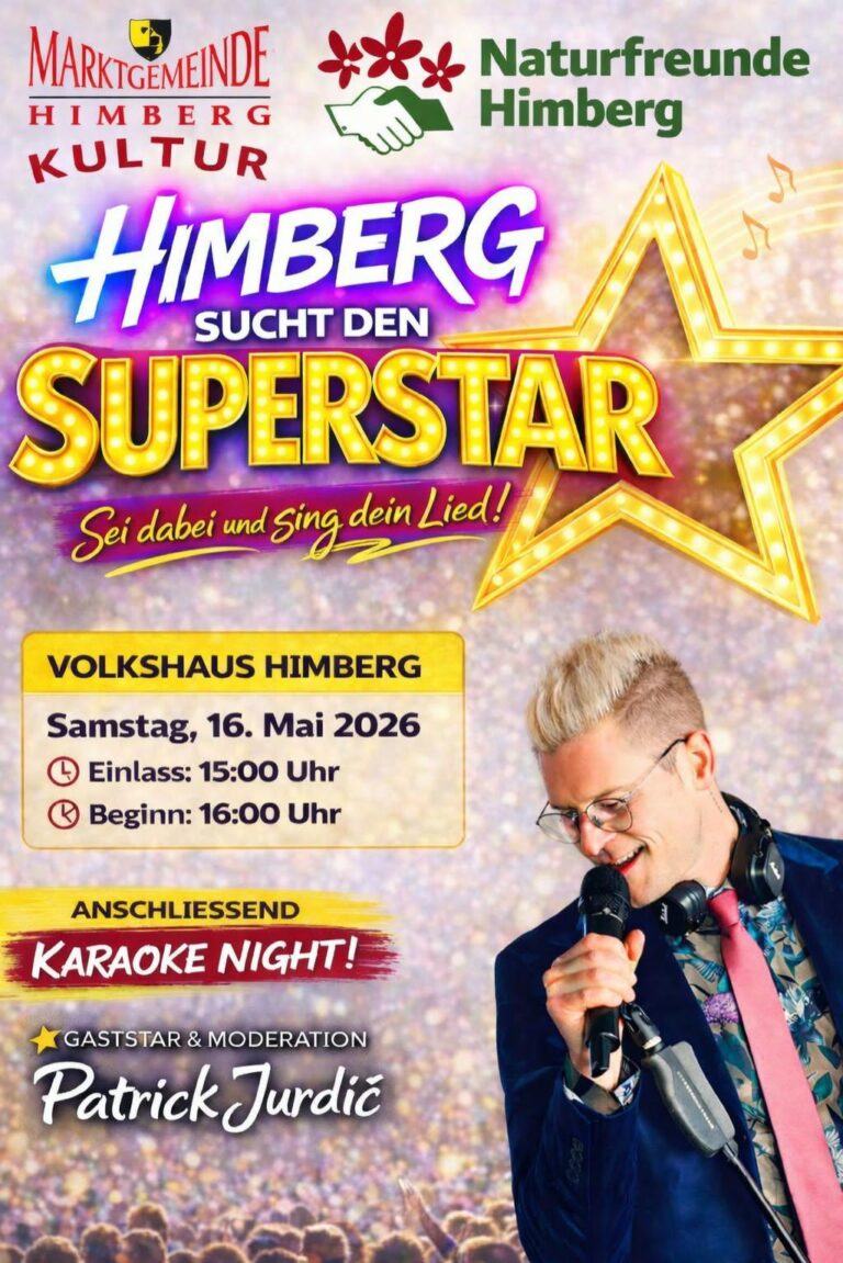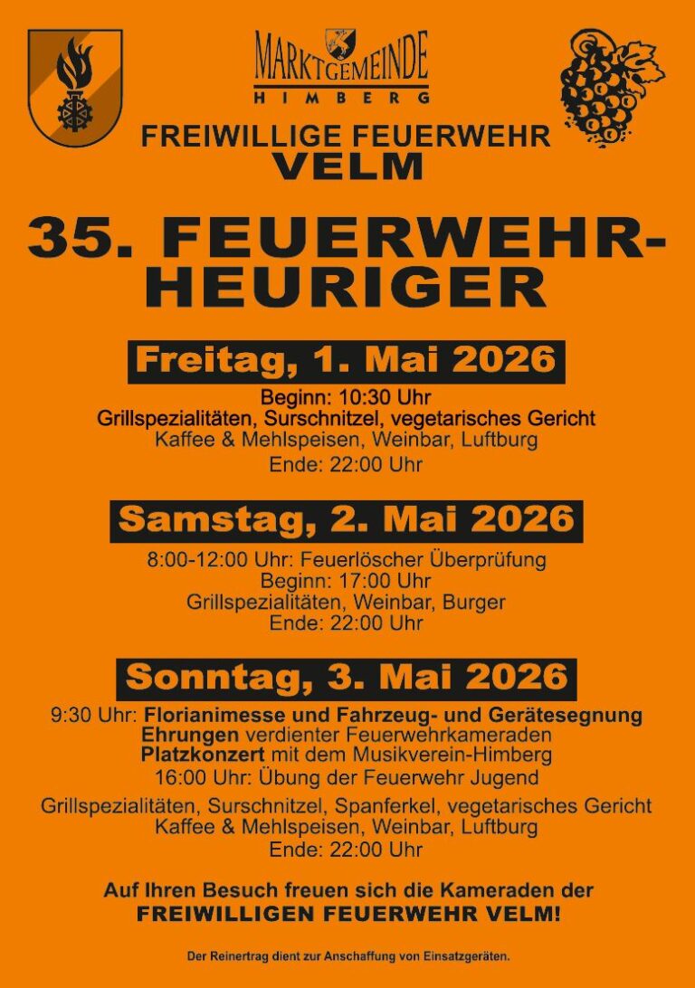 MAI 2026 35. Feuerwehrheuriger1. Mai 202610:30Freiwillige Feuerwehr Velm MEHR INFO 35. Feuerwehrheuriger2. Mai 202617:00Freiwillige Feuerwehr Velm MEHR INFO 35. Feuerwehrheuriger3. Mai 202609:30Freiwillige Feuerwehr Velm MEHR INFO Himberger Monatsmarkt9. Mai 202608:00Parkplatz Sportplatz, Friedrich-Lux-Straße 16 MEHR INFO Wings for Life Run10. Mai 202613:00Treffpunkt: Bewegungsarena (Höhe Sporthalle) MEHR INFO Heimatkundliche Abende12. Mai 202619:00Hotel "Das Himberg" MEHR INFO Himberg sucht den Superstar16. Mai 202616:00Volkshaus Himberg MEHR INFO
