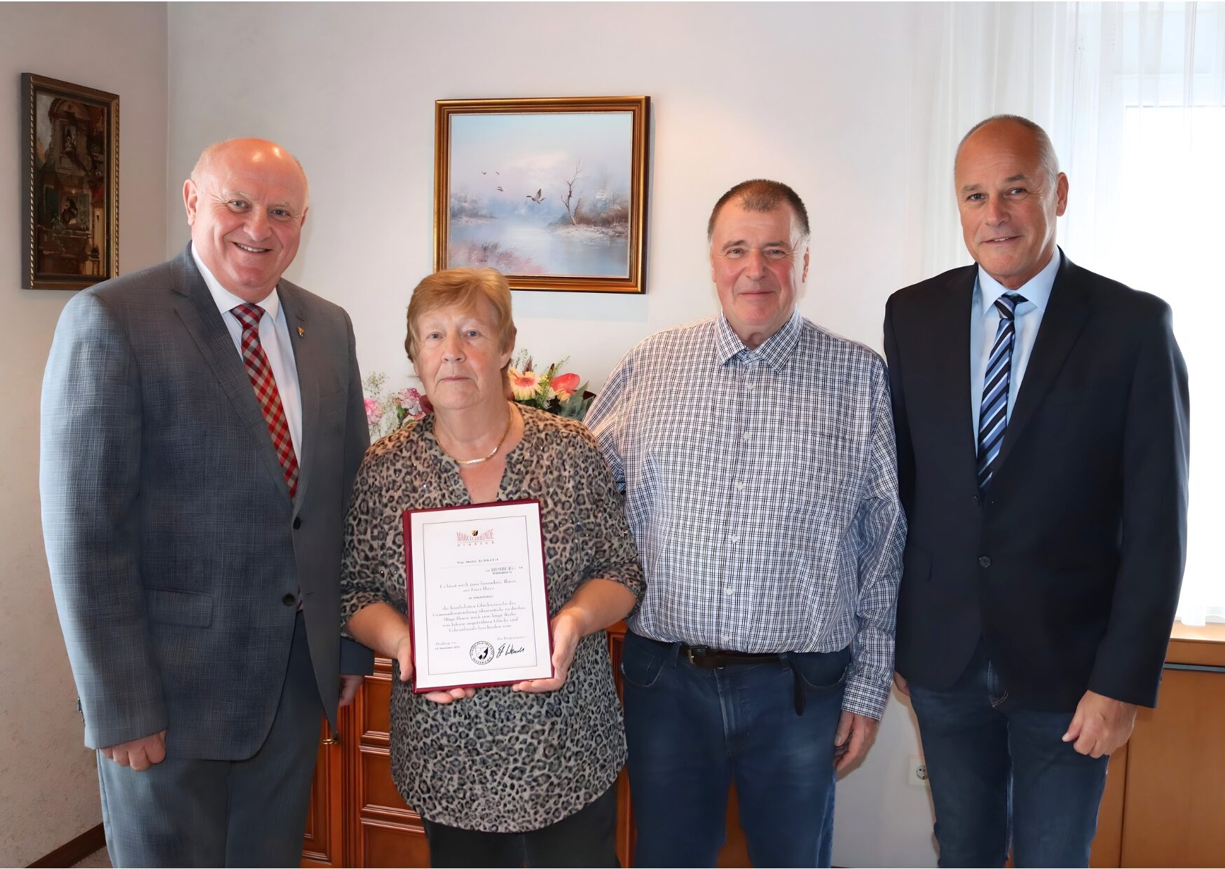 Vor Kurzem feierte Frau Martha Blanarik aus Pellendorf ihren 80. Geburtstag. Es gratulierten herzlich Bürgermeister Ing. Ernst Wendl, Gemeinderat Walter Jakob und Gatte Blanarik Karl. (Foto: Marktgemeinde Himberg)