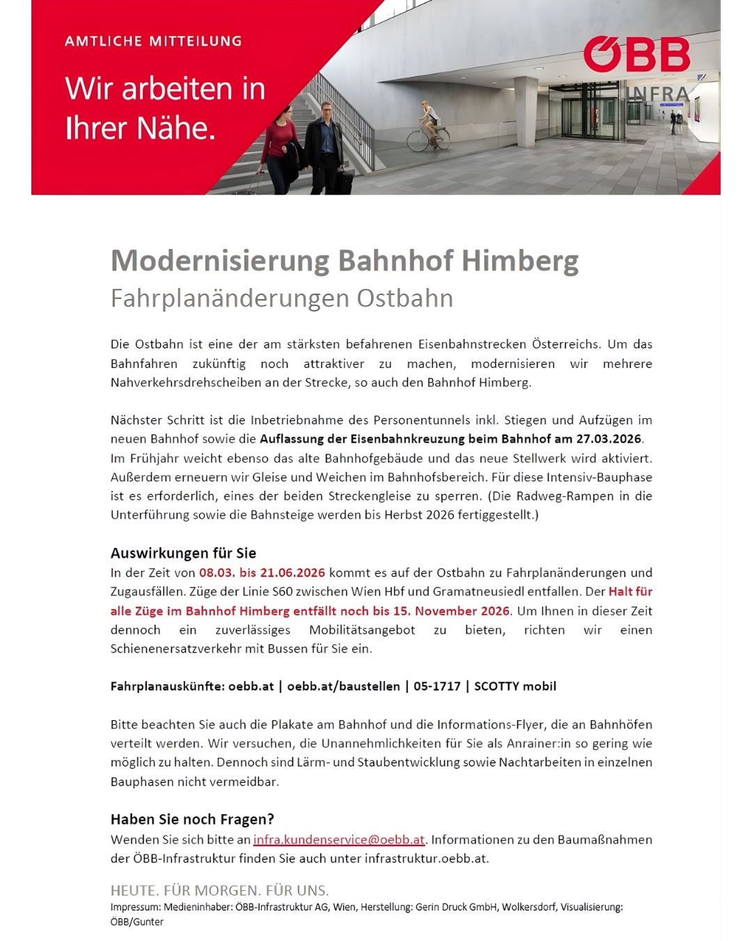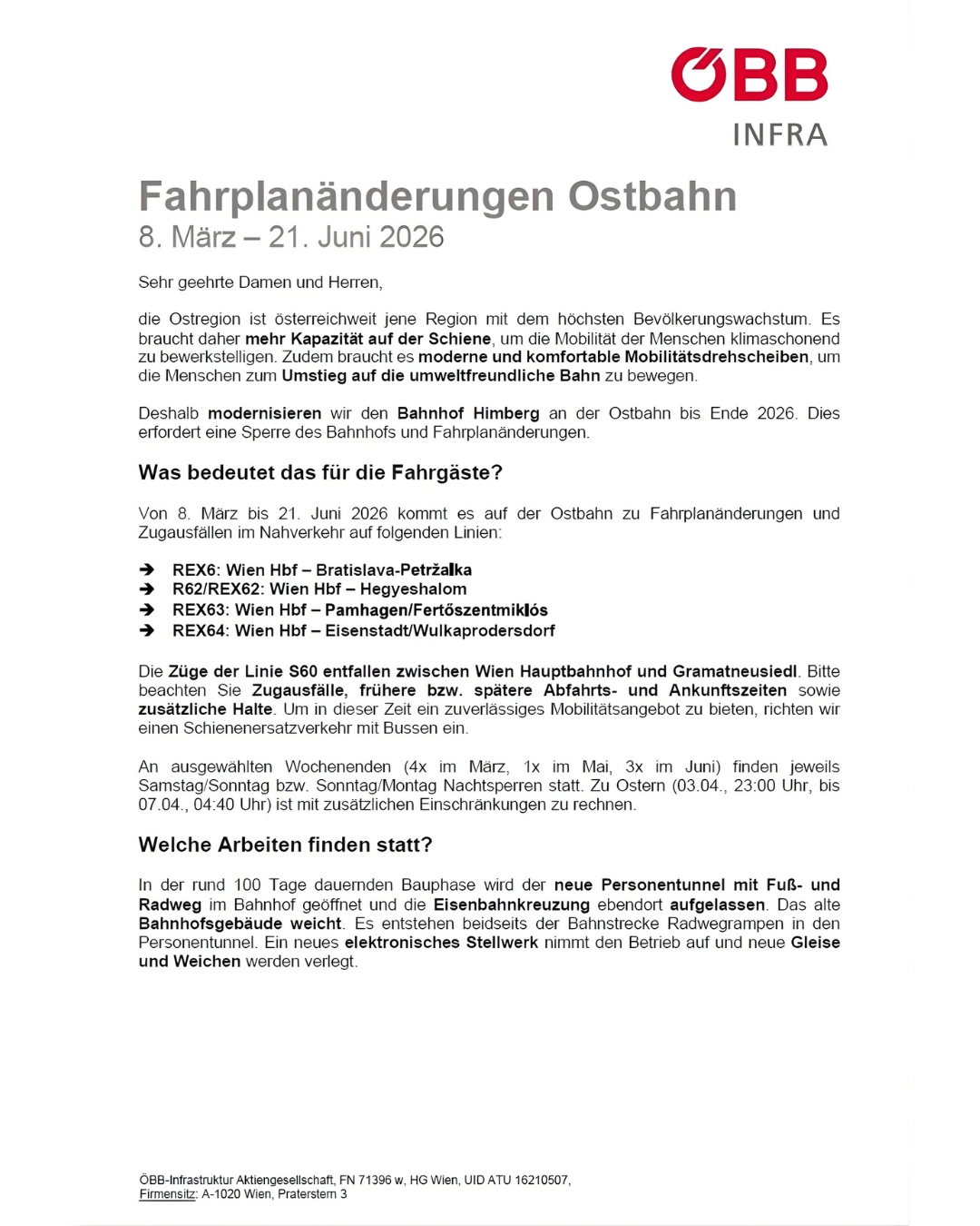 Modernisierung Bahnhof Himberg – Fahrplanänderungen Ostbahn 8.3. – 21.6.2026