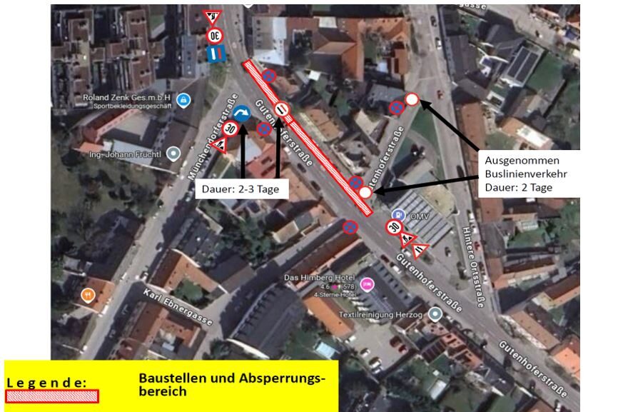 - Rechtsfahrgebot im Kreuzungsbereich Münchendorferstraße / Gutenhoferstraße (voraussichtlich 2–3 Tage)